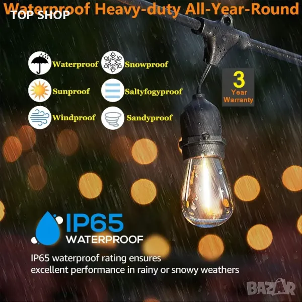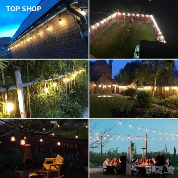 15 метра стрингови лампи + 3M удължителен кабел - няма нужда да купувате допълнителен удължителен кабел, за да спестите парите си и да го използвате за външни светлини. IP65 водоустойчиви външни струнни светлини - тежък кабел, съчетан с нечупливи LED крушки, може да издържи при всяко време, независимо от дъждовни, горещи и мразовити дни, може да се използва навън през цялата година. Енергийно ефективни нечупливи осветителни тела за вътрешен двор - 1W led крушка, равна на 11W лампа с нажежаема жичка, с по-висока яркост. Това ще спести пари с 90% от сметката за електричество. Разнообразни приложения - тези външни осветителни тела с фестон пасват на вашата градинска ограда, осветителни тела за вътрешен двор, покрив на къща, декорация на пергола, осветителни тела за беседка, дървета, заден двор и всички възможни места.