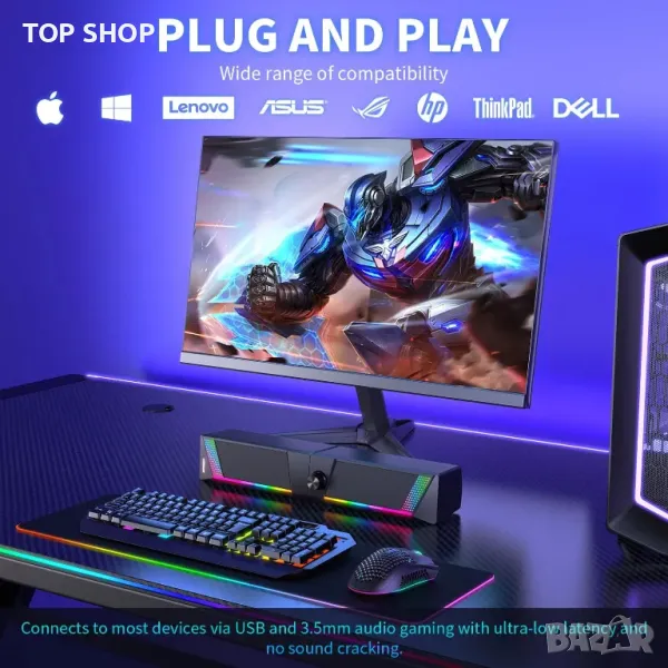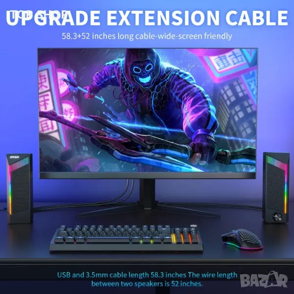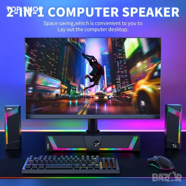 Тази система от високоговорители за компютър 2 в 1 може да функционира като отделни стерео високоговорители или да се комбинира в звукова лента за гъвкаво разположение на работния плот. Той разполага с двойни 5W драйвери за висококачествен стерео звук и предлага plug-and-play съвместимост чрез USB и 3,5 mm аудио кабел с различни операционни системи. Чувствителен на допир панел позволява лесно управление на RGB осветлението с четири режима за подобряване на игровата атмосфера. Удължените кабели предоставят разнообразни опции за настройка, докато едно копче опростява регулирането на мощността и силата на звука.