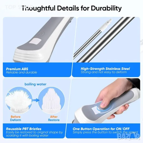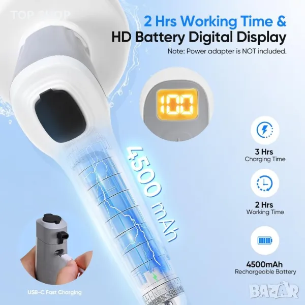 Тази мощна почистваща четка е оборудвана с акумулаторна 3,7 V 4500 mAh батерия, която предлага до 2 часа непрекъсната употреба след само 3 часа бързо зареждане. Състоянието на батерията се вижда лесно на цифровия дисплей с висока разделителна способност. Може да се зарежда удобно чрез USB-C при 5V 1A (захранващ адаптер не е включен). Главата на четката с рейтинг IP68 е устойчива на прах и пръски, което гарантира издръжливост при различни сценарии на почистване. С регулируема дължина, варираща от 61 см до 127,5 см, прибиращата се дръжка от неръждаема стомана позволява лесно почистване на труднодостъпни места, което я прави идеална за хора с болки в гърба или артрит. Мощният мотор осигурява ефективно почистване без надраскване на повърхности, а функцията за управление с един бутон опростява процеса на почистване, като не оставя нито един ъгъл недокоснат.
