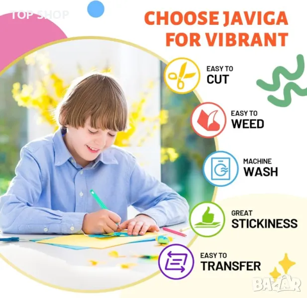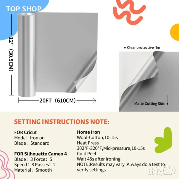 JAVIGA Silver Heat Transfer Vinyl (HTV), с размери 12" x 20 фута, е универсален и издръжлив избор за всички ваши проекти за текстил "Направи си сам". Съвместим с повечето машини за рязане на винил, той е идеален за персонализиране на дрехи, чанти и аксесоари. Това HTV се отличава със своята дълготрайна адхезия и възможност за пране, способен да издържи многократни цикли на пране без избледняване, обелване или разкъсване, въпреки че изисква 24-часов период на изчакване преди първото измиване и не трябва да се мие с гореща вода. той е водоустойчив и устойчив на ултравиолетови лъчи, което гарантира, че вашите дизайни запазват качеството и цвета си при различни метеорологични условия Лесен за рязане и премахване, винилът разполага с дебела носеща хартия за прецизно премахване и безпроблемно пренасяне, което го прави идеален за създаване на персонализирани подаръци за специални поводи като Коледа и годишнини.