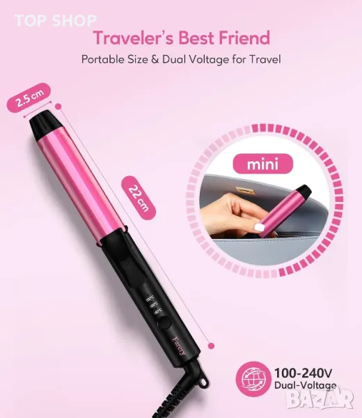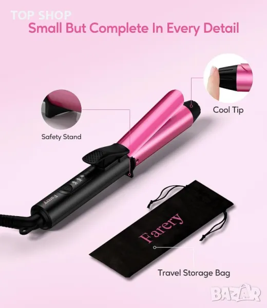 Малките клещи за къдрици Farery са идеален спътник при пътуване, разполагат с дизайн с двойно напрежение (100V-240V) за употреба по целия свят само със захранващ адаптер. Компактният му размер, само 22 см дължина и 200 г тегло, го прави изключително преносим и подходящ за всяка чанта или чанта. 25-милиметровият цилиндър е многофункционален, ефективен за къса, средна и дълга коса, предлага обем близо до корените и възможността да функционира както като малка преса със скоба, така и като мини къдрене. Разполага с три регулируеми температури (160/180/200°C) за различни текстури на косата и 100% дизайн против изгаряне с 2 см изключително дълъг хладен връх и предпазна стойка за предотвратяване на изгаряния. Подсилен с кератин, арганово масло и турмалин, керамичният корпус осигурява равномерно разпределение на топлината, освобождавайки отрицателни йони за блестящи, полирани къдрици, като същевременно минимизира увреждането на косата. Тази маша също така е лесна за употреба с 6,5 фута изключително дълъг въртящ се на 360° кабел за оформяне без заплитане и се доставя с чанта за съхранение при пътуване, което я прави идеална за използване както у дома, така и при пътуване.