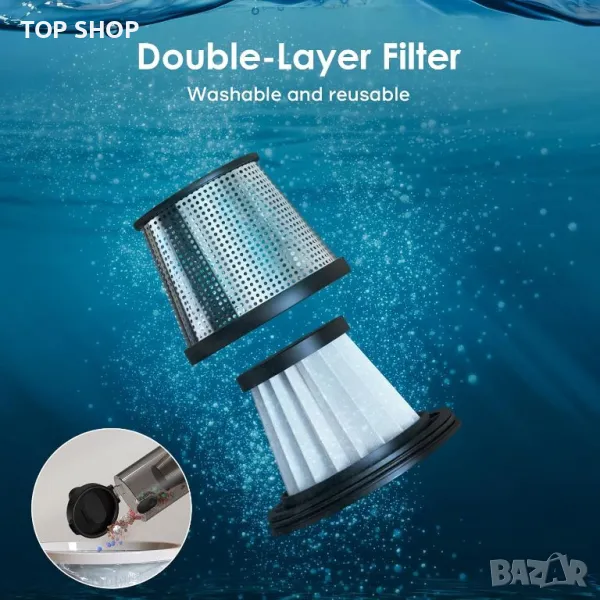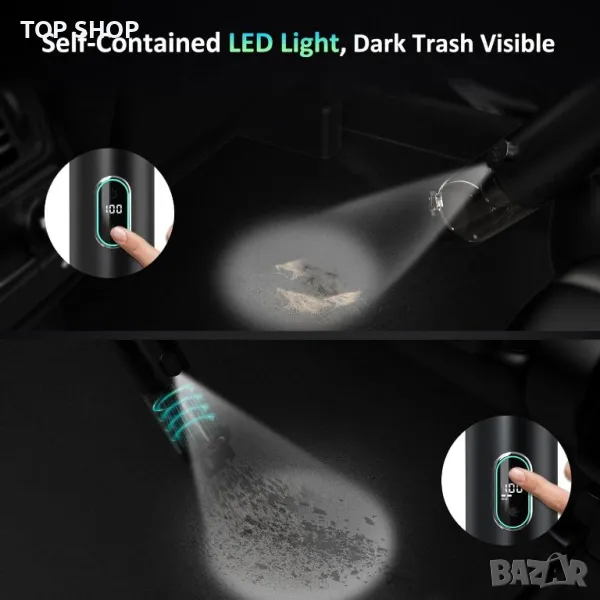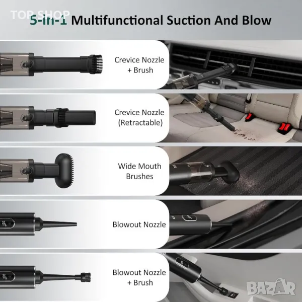 безжична прахосмукачка предлага мощно засмукване с два режима: режим MAX осигурява 16000 PA за 18 минути интензивно почистване, а режим ECO предлага 10000 PA за 35 минути ежедневно почистване. Той разполага с високоефективен мотор, което го прави идеален за почистване на косми от домашни любимци, прах и отпадъци както у дома, така и в колата, като работи при ниско ниво на шум под 70dB. Оборудван с 5 многофункционални дюзи, той отговаря на различни нужди за почистване, включително пукнатини, кухненски чекмеджета, килими и др. Прахосмукачката има 7500mAh акумулаторна батерия с 3,5-часово бързо зареждане, LED дисплей за следене на мощността и LED светлина за тъмни зони. Включва двойна система за филтриране със стоманена мрежа и HEPA филтър, 150 ml чаша за прах и дизайн за отстраняване на прах с едно докосване. Лек и лесен за съхранение, той се предлага с чанта за съхранение за удобство, което го прави идеален за пътуване и къмпинг.