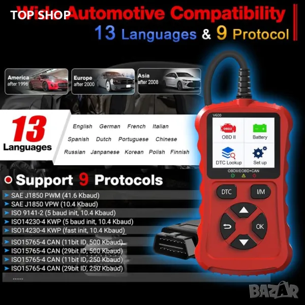 iKiKin V600 е многофункционален автомобилен скенер OBD2, който поддържа всички OBDII функции, включително четене и изчистване на кодове за грешки, изключване на MIL и показване на данни в реално време като скорост на двигателя, скорост на превозното средство и температура на охлаждащата течност. Той предлага откриване на дим с едно щракване, тестване на O2 и EVAP система и включва изчерпателна библиотека с кодове за DTC грешки. Съвместим с повечето превозни средства от 1996 г. и по-нови в различни региони, той поддържа 13 езика (но не и български) и има здрав дизайн с 1,8-инчов цветен екран за ясно и лесно четене. Идеално за диагностициране на проблеми с двигателя и извършване на превантивни проверки, това устройство не изисква външни батерии и се актуализира автоматично с нови модели автомобили, което го прави практичен инструмент за всеки собственик на автомобил.