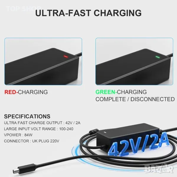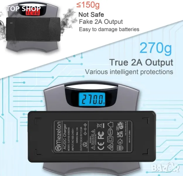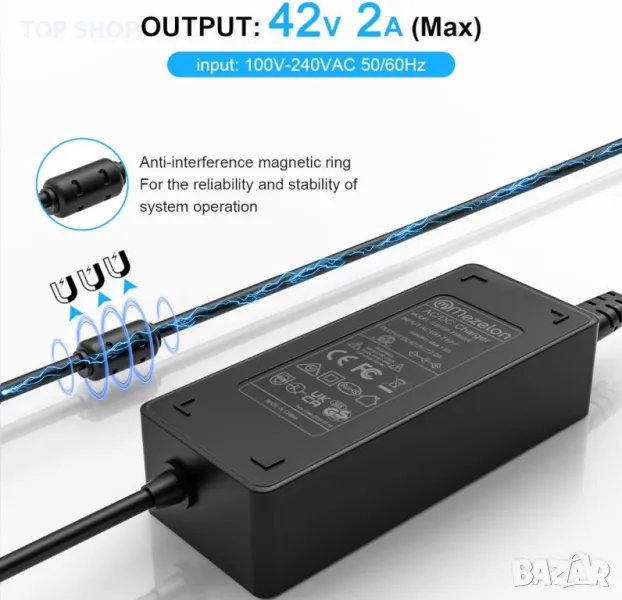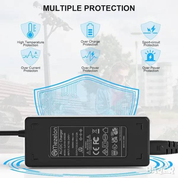 Mezelon CHARGER е предназначено за 36V литиево-йонни батерии, с входно напрежение 100-240VAC 50/60Hz и изход 42V 2A. Гарантира висока сигурност, отговаряйки на законите на ЕС за електрическа безопасност и електромагнитна съвместимост и UKAC сертификат. Интегрираните интелигентни платки осигуряват защита срещу презареждане, пренапрежение и късо съединение. Моля, проверете съвместимостта със спецификациите на вашето устройство преди покупка, тъй като това зарядно устройство не е подходящо за оловно-киселинни батерии.