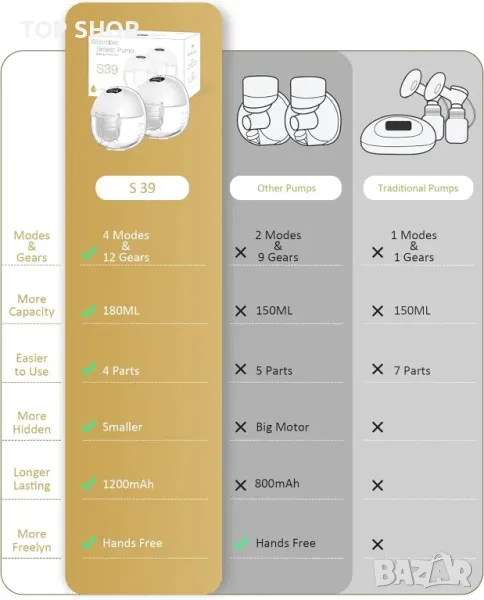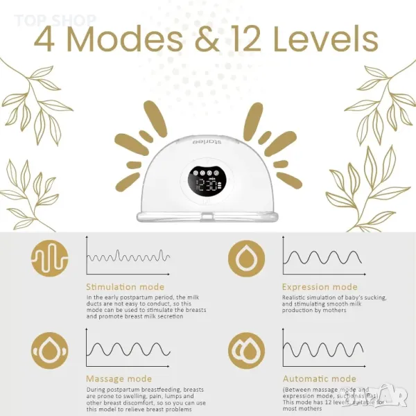 Тази усъвършенствана електрическа помпа за кърма възпроизвежда моделите на хранене на бебето, за да оптимизира производството на мляко и е направена от хранителен силикон за безопасност. Дизайнът със свободни ръце, който може да се носи, позволява удобна употреба у дома, в офиса или по време на пътуване, включващ по-голям контейнер за мляко от 180 ml в сравнение с модела S32, за да се сведат до минимум прекъсванията на изцеждането. С мощна батерия от 1200 mAh, той поддържа продължителни сесии на изцеждане и двойно изцеждане на гърди, за да спести време и да увеличи общото количество кърма. Насладете се на адаптивно изживяване с 12 регулируеми нива на засмукване и 4 режима, докато работите тихо при 45 децибела за дискретна употреба. Допълнителните интелигентни функции включват 30-минутно автоматично изключване за безопасност и функция за памет, която запазва вашите предпочитани настройки.