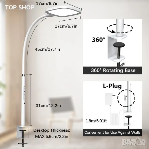 Тази 20 W настолна лампа се отличава с яркост от 1500 лумена и обширна 17 см квадратна глава за равномерно осветление. Използвайки LED технология с осветени ръбове, той предлага меко осветление за минимизиране на напрежението на очите. Персонализирайте своята яркост (20%-100%) и цветова температура (3200K-6500K) чрез сензорни контроли или предоставеното дистанционно управление, което също съхранява вашите предпочитани настройки. Алуминиевата структура на лампата позволява завъртане на 360° за оптимално позициониране, докато нейната здрава гъша шийка поддържа стабилност. Лесно монтирайте тази спестяваща място лампа със своята функция за затягане, подходяща за повърхности с дебелина до 5,6 см. Пакетът включва лампа, отвертка, винтове, захранващ адаптер, дистанционно и ръководство за потребителя.
