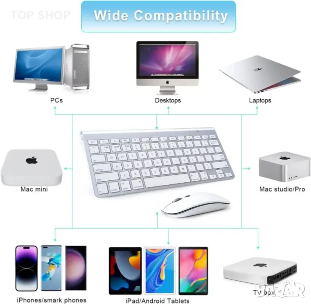 Безжичната клавиатура и мишка предлагат универсална съвместимост, идеална за Apple