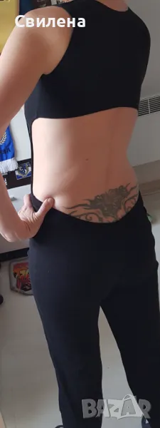 Страхотен памучен дамски гащеризон, отговорящ на размер S/M, с изрязан гол гръб. Моделът е много удобен и ефектен, материята е много еластична. Обличан е веднъж.