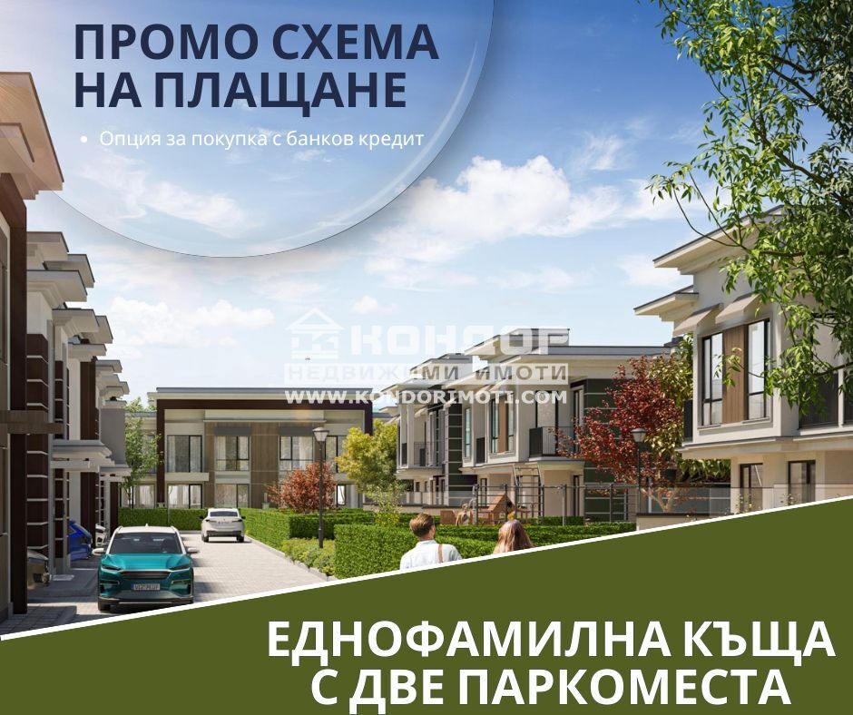 Оферта 66578: Гъвкави схеми на Плащане с опцията 20% на Предварителен Договор и 80% на Акт 14 и вариант за 80% на Акт 16 !!! Предлагаме Ви еднофамилна къща в един от най-иновативните ни жилищни комплекси от луксозни градски къщи със собствен стил, изчистена и модерна визия, проектиран така, че да създаде максимален комфорт и уют за живеене. Проектът предстаявлява комплекс от просторни и панорамни къщи, озеленен вътрешен двор с оформен детски кът и зелени зони за релакс и почивка. Паркирането е решено с по две Паркоместа към всяка къща включени в обявената продажна цена. Къщите са разделени в два оснтовни типа редови и дуплекс, като всяка от тях разполага с двор, веранда и две паркоместа. Конкретната къща е със следното разпределение : на първо ниво са разположени просторна и слънчева дневнва - 43.70 кв.м. с трапезария и обособена кухненска част с излаз към веранда с площ от 19.00кв.м. и озеленен двор с площ от 35.50кв.м., входно антре санитарен възел. На второ ниво се намират три самостоятелни спални, като родителската разполага с дрешник и собствена баня, двете детски стаи ползват втора баня с тоалетна и разполагат с обща за двете стаи тераса. На сутеренно ниво имаме функционално складово помещение с площ от 25.50кв.м., подходящо за фитнес, спа зона, зала за игри и развлечения, механа и други дейности. Комплексът привлича вниманието със своята локация, разположена в един от най-желаните и бързоразвиващи се нови квартали с нискоетажно строителство, с лесен и бърз достъп по асфалтов път към Централна градска част, чисто нова инфраструктура, безупречна поддръжка, контролиран достъп. Възможност за закупуване чрез банков кредит на изключително изгодни условия за клиенти на Агенцията !!! Обявената цена е без ДДС!!!ВИЖТЕ ОЩЕ ИЗГОДНИ ОФЕРТИ НА https://www.kondorimoti.com/ С ЕЖЕДНЕВНА АКТУАЛИЗАЦИЯ!