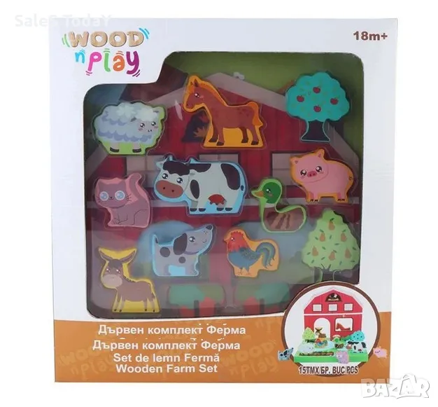 Комплект дървени строителни блокове Фигури на ферми и животни 15 бр.