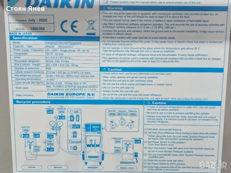 , снимка 1 - Други машини и части - 49568202 Машина за рецеклиране на хладилен газ DAIKIN-RRDQ220V1