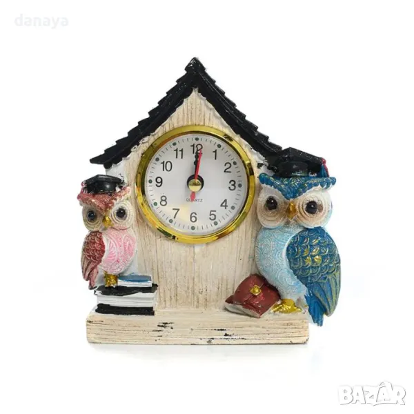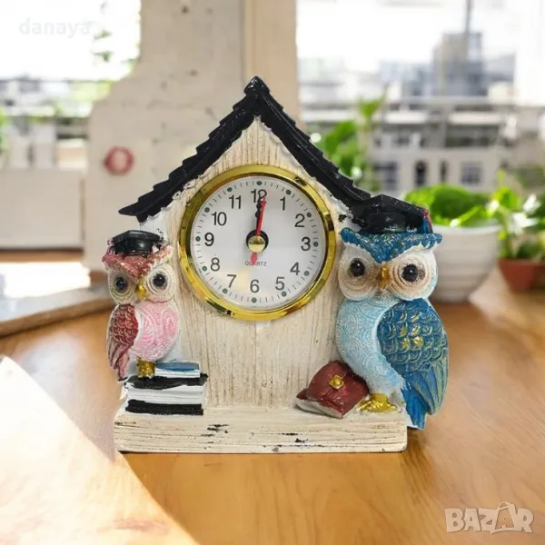 Този компактен настолен часовник „Къщичка с две бухалчета“ не е просто декорация – той носи символика на знание и успех! До едното бухалче има книги, а до другото – раница, напомняйки за ученето и новите начинания. С диаметър на циферблата 5 см, той е едновременно декоративен и практичен, като внася уют и топлина в пространството.