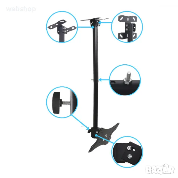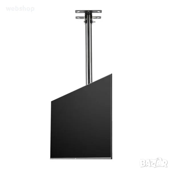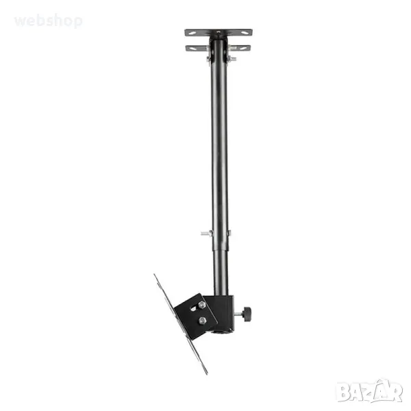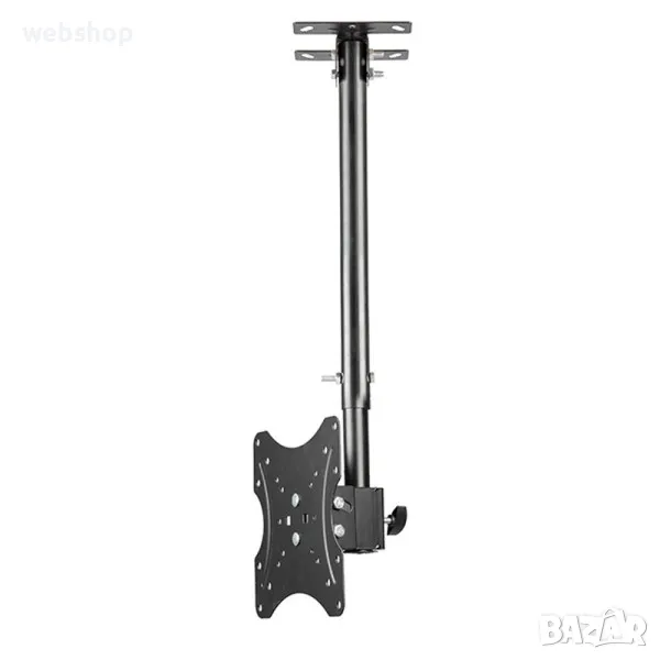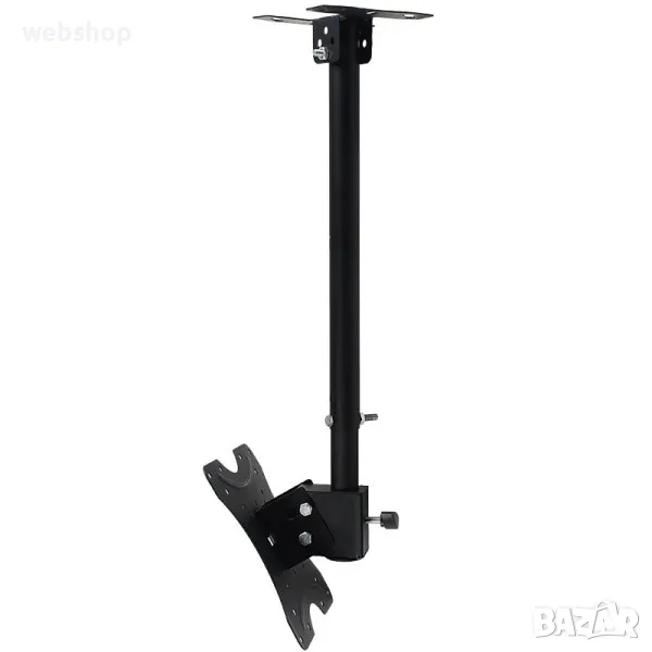 Универсална ТВ стойка за таван за вашия бизнес. Тази практична и удобна стойка за телевизор за таван е чудесен избор за вашия бизнес. Тежи едва 3 килограма, но е изработена от висококачествена подсилена студено-пресована стомана и може да издържа на натоварване до 25 килограма. Притежава семпъл и елегантен дизайн, който се вписва чудесно в различен стил на интериора и няма опасност да наруши цялостния вид ва вашето заведение, офис, магазин или друго. Телевизионната стойка е с лесен и бърз монтаж, а в комплекта с нея ще получите и всички принадлежности като винтове и дюбели, които ще ви бъдат необходими за сигурния и безпроблемен монтаж.