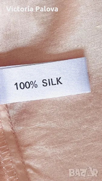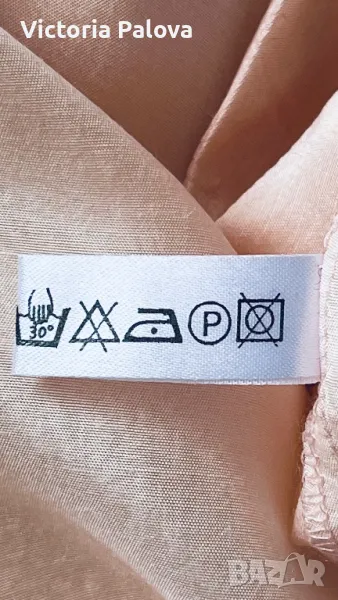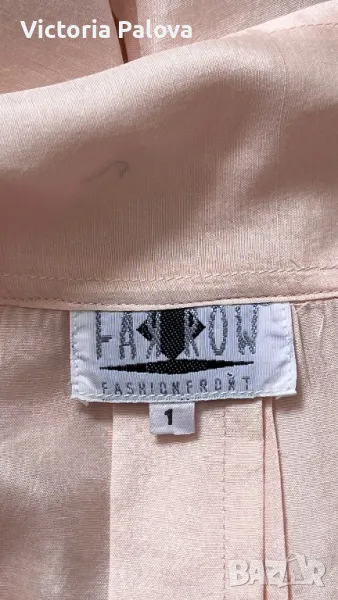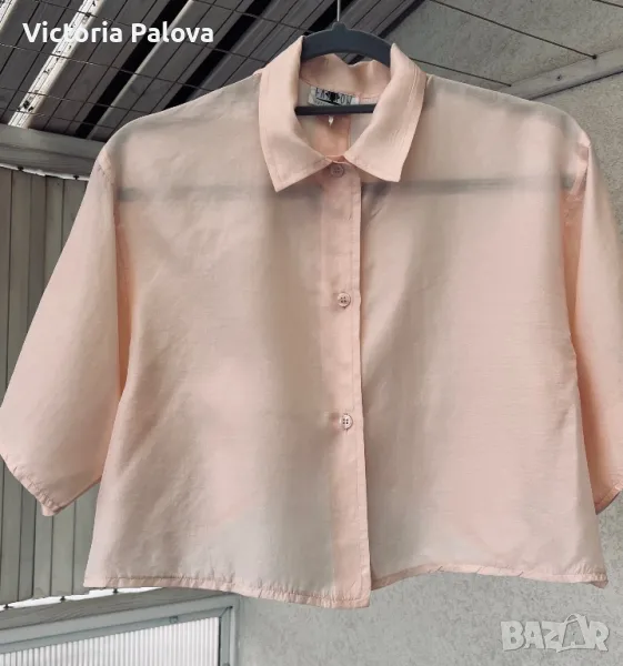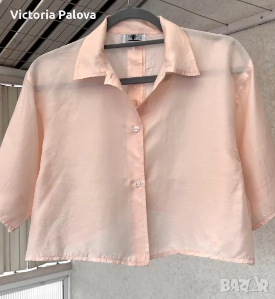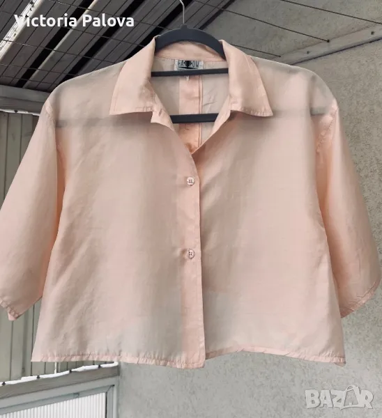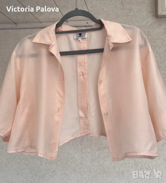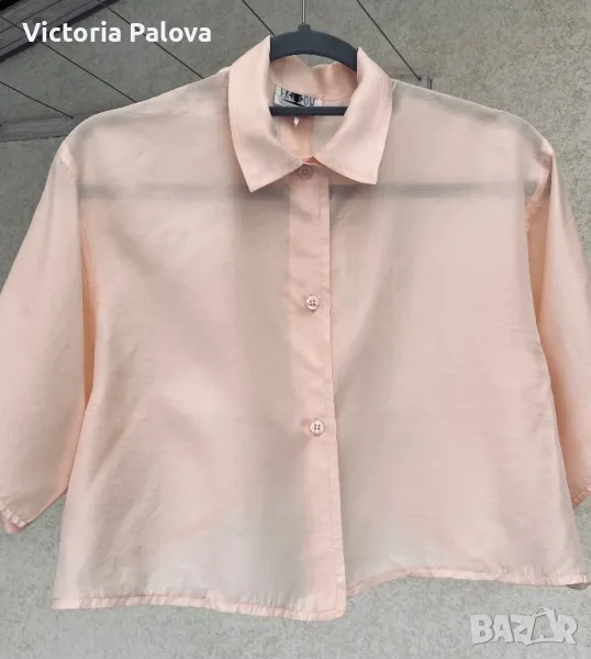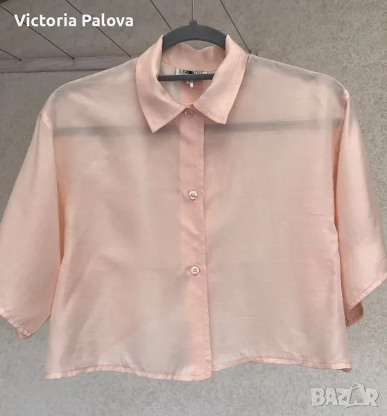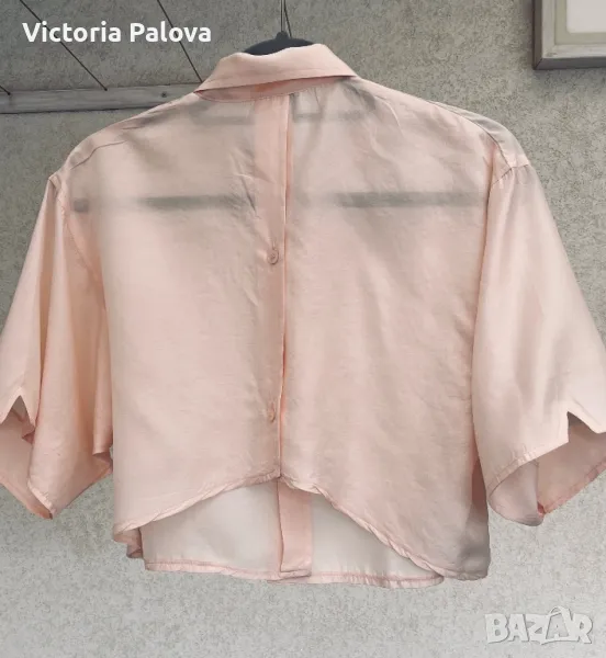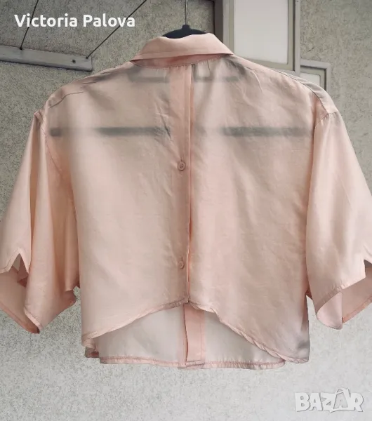 Блузата е много интересна - със закопчаване отпред като риза и отзад на гърба - интересен детайл-закачка. Кройката е права, кроп, като отпред дължината е 46см, отзад е по- късо, 37см, изрязано на ^. Рамото е 46см, съответно и ГО също, ръкавът е широк, 28см, дълъг - 24см. Цветът е нежен розов, лека тънка коприна с блясък.