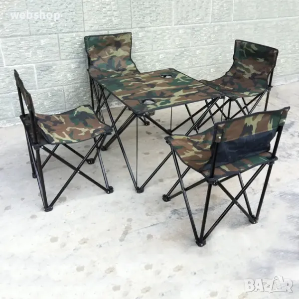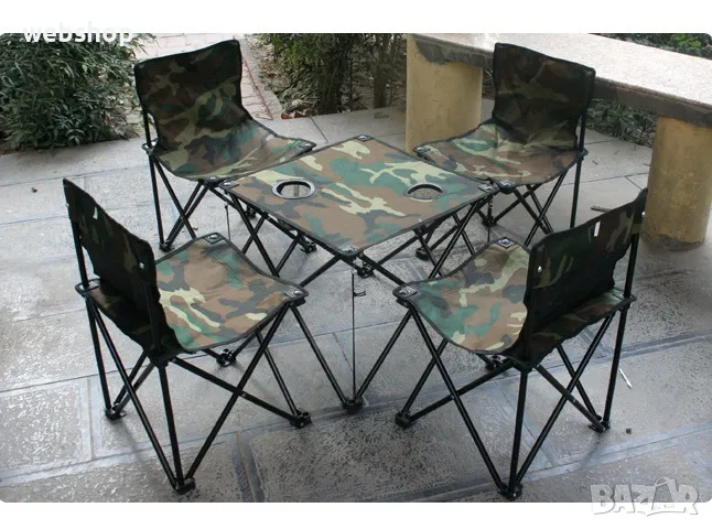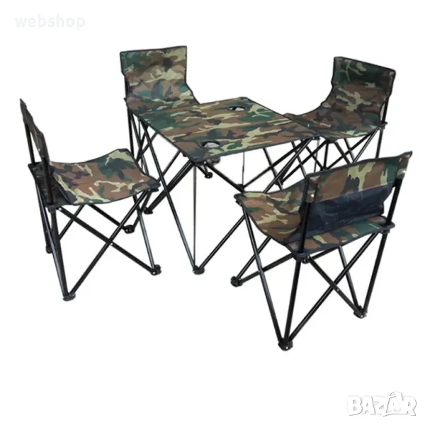 Комплект за къмпинг състоящ се от четири сгъваеми стола, масичка с отделения за напитки и сак за съхранение и лесно пренасяне на всякъде с Вас.