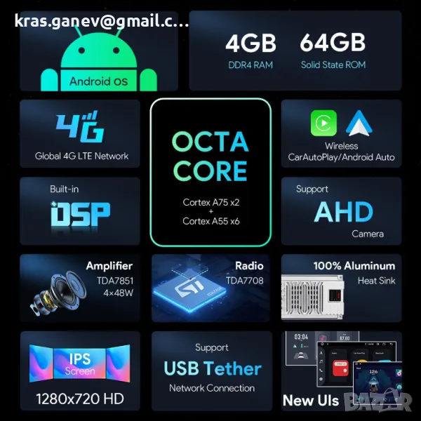 Мощна стерео уредба за кола с Android Захранван от осемядрен чип