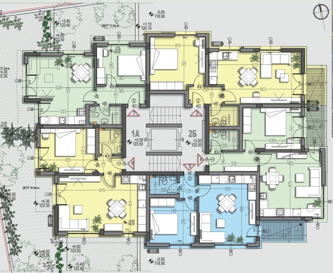 Апартамента се намира на партерен етаж, 86 м2, състои се от хол с кухненска част, две спални, баня с тоалетна, коридор и прилежаща маза. Имота има собствен двор от 52 м2 и възможност за закупуване на паркомясто или гараж.
