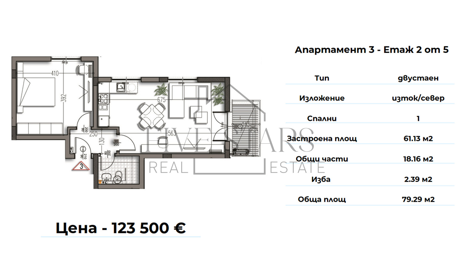 ФАЙВ СТАРС предлага двустаен апартамент в новострояща се сграда, в спокоен и същевременно с отлична инфраструтура район. В близост са магазини, спирка, училище и детски заведения. Апартамента се намира на втори жилищен етаж, състои се от хол с кухненска част, спалня, баня с тоалетна, коридор и тераса. С възможност за закупуване на паркомясто или гараж.