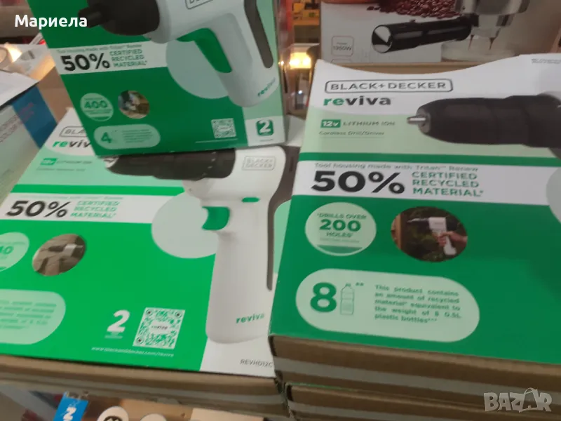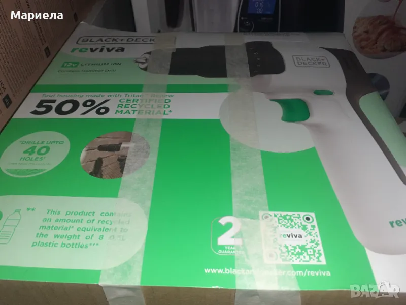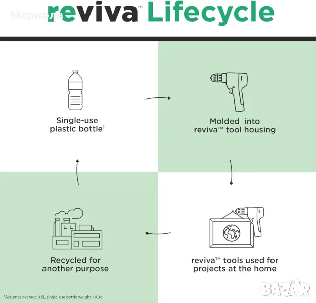 ECO - Корпус, изработен от Tritan Renew, еквивалентът на 18 бутилки за вода за еднократна употреба се използва повторно за направата на тази бормашина.
