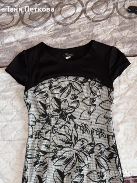 Стилна дамска рокля,подходяща както за различни поводи и събития, така и за ежедневие.Бг произведена от фирма "Рени."Отпред материята е релефна,отзад трикотаж.С малко ръкавче,прав силует.По етикет L,но отговаря на М(S).Много запазена ,обличана два,три пъти.