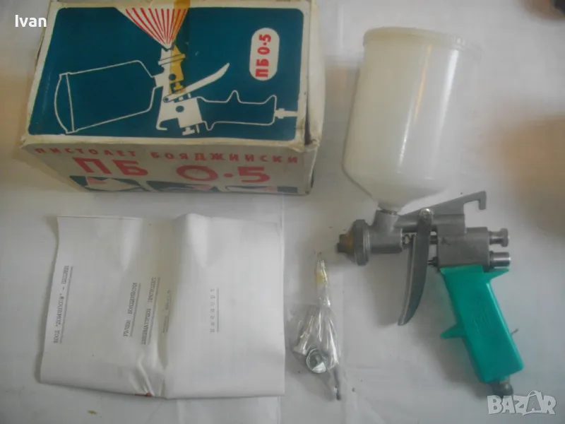 бояджийски пистолет, българско Соц старо висококачествено производство, което в съвремието липсва. Пълен комплект. Марка и модел на пистолета модел ПБ - 0,5., БДС 3916-73. Производител - завод "Ломоносов" - Плевен.