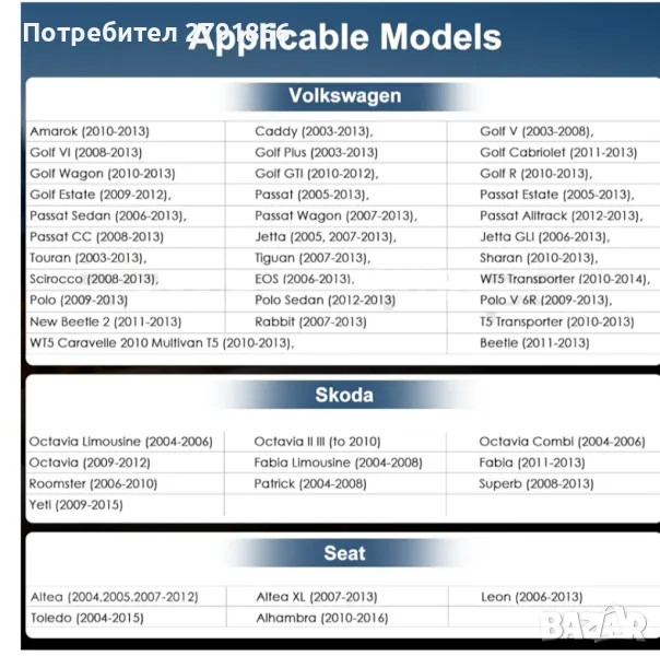 - Golf 5(2003 - 2009 ) Golf 6 ( 2008 - 2013 ) Golf plus ( 2009 - 2013 ) Golf GTI ( 2003 - 2013 ) Golf R ( 2003 - 2013 ) Golf estate ( 2009 - 2012 ) EOS ( 2006 - 2013 ) Scirocco ( 2008 - 2014 ) Polo ( 2009 - 2013 ) Polo sedan ( 2012 - 2013 ) Passat variant ( 2005 - 2013 ) Passat CC ( 2008 - 2013 ) Passat B6 3C ( 2005 - 2010 ) Seat Altea(2004 - 2012) Leon(2006 - 2013)Skoda Fabia ( 2007 - 2014 ) Superb ( 2008 - 2014 ) Yeti ( 2008 - 2017 ) Octavia ( 2009 - 2012 )