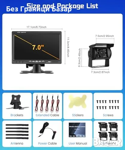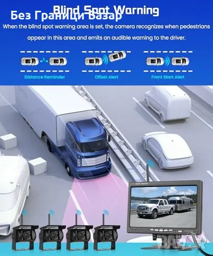 Широка съвместимост – работи с 12V-36V превозни средства, монитор с 4 входа за камери.
