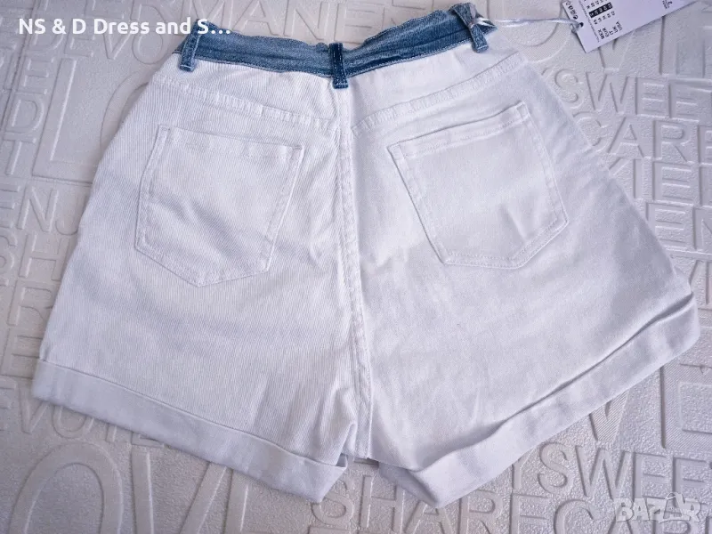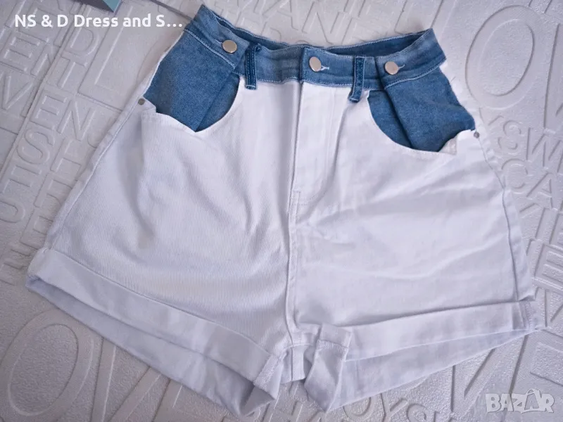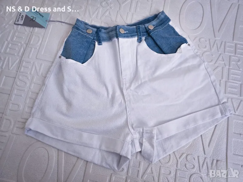 Дамски атрактивни къси дънкови панталонки.Със син деним в горната част,долната част е бял деним.Модела е мек и еластичен деним.