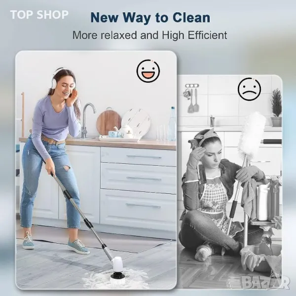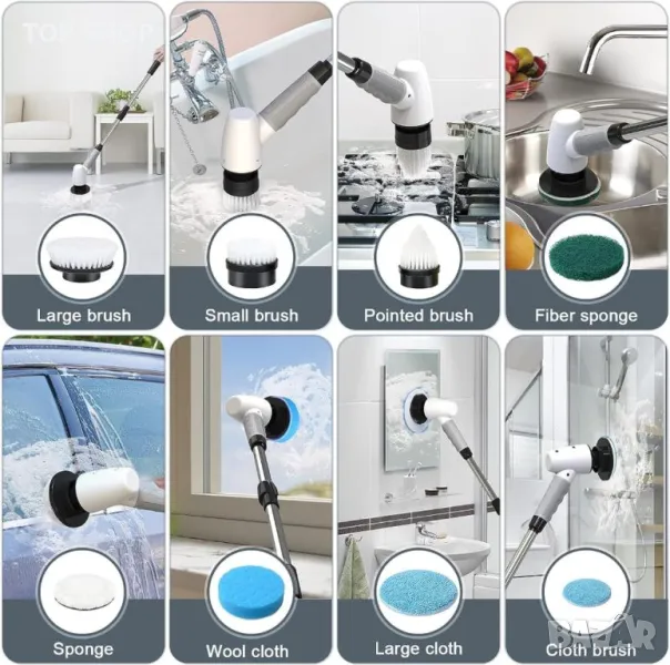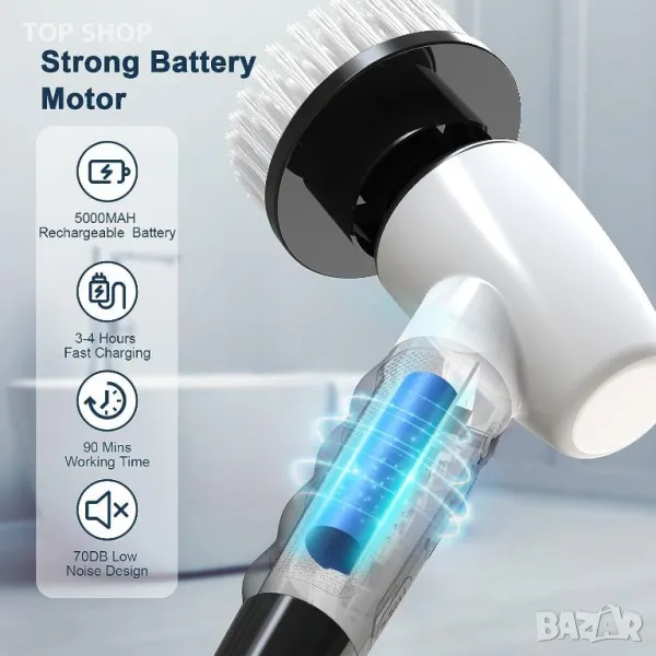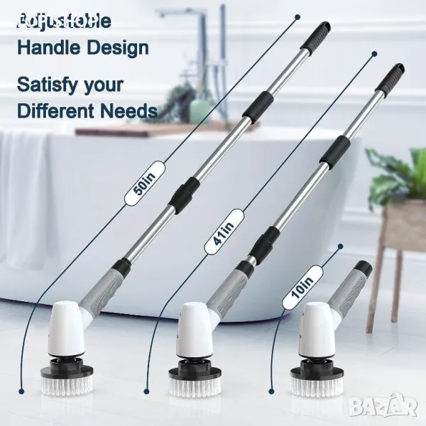 Този електрически скрубер предлага удобно и ефикасно решение за почистване със своята модерна технология и безжичен дизайн. Оборудван с мощна батерия от 5000mAh, той може да работи 90 минути при пълно зареждане и разполага с пет индикатора за батерията за наблюдение на нивата на мощност. Скруберът има регулируеми дължини от 30, 104 и 127 см, като отговаря на различни нужди от почистване и позволява работа без навеждане. Той разполага с две скорости (270RPM и 400RPM) за персонализирана интензивност на почистване, е IPX6 водоустойчив за използване при мокри условия и се предлага с осем сменяеми глави на четки, подходящи за различни задачи за почистване като бани, кухни и автомобили. Забележка: Не потапяйте цялата дръжка във вода.