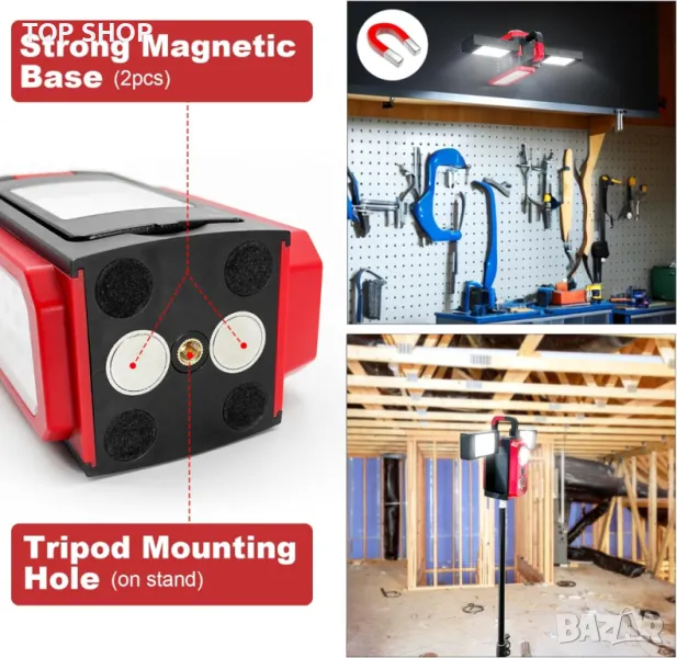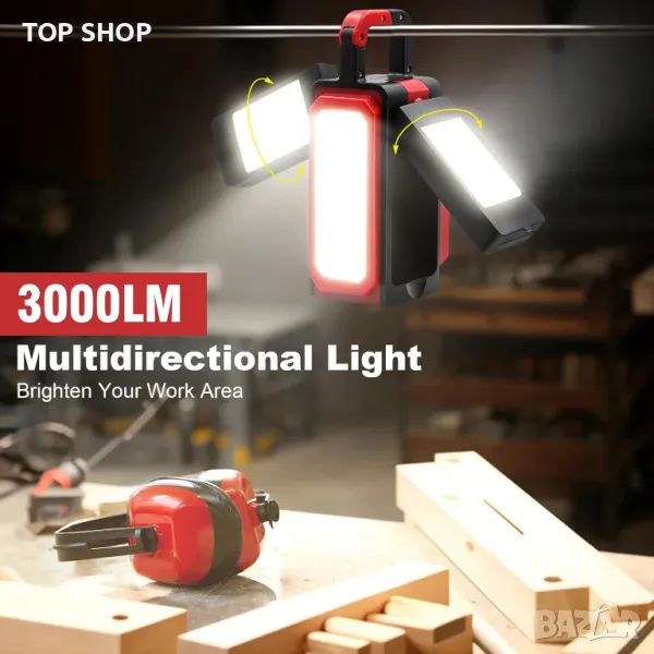 работна лампа предлага разнообразно осветление с два регулируеми прожектора, които се въртят на 180° нагоре и надолу и на 270° настрани, допълнени от 4 режима на осветяване, включително мощно фенерче. Излъчвайки 3000 лумена с 58 бели светодиода с висок лумен и един светодиод CREE P50, той осигурява изключителна яркост за всяко работно пространство, с до 9 часа работа благодарение на своята акумулаторна литиева батерия от 4400 mAh. Дизайнът му с кука и магнит позволява работа без ръце и сигурно закрепване към различни повърхности, докато първокласната ABS конструкция гарантира издръжливост и IPX5 водоустойчивост за надеждна работа на закрито и на открито. Освен това той функционира като захранваща банка за аварийно зареждане на устройства, което го прави основен инструмент за работа или ежедневни задачи.