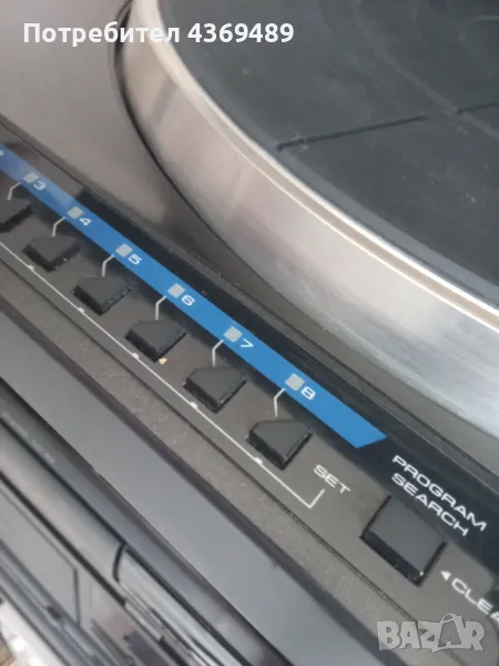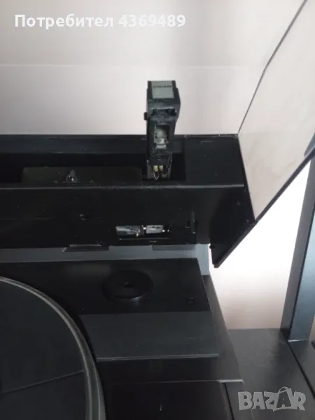 Всичко работи,с тангенциално рамо и оригинална доза .Качествен звук ,избор на песен с програма.Пукнатината на капака съм я снимал.Крайна цена.