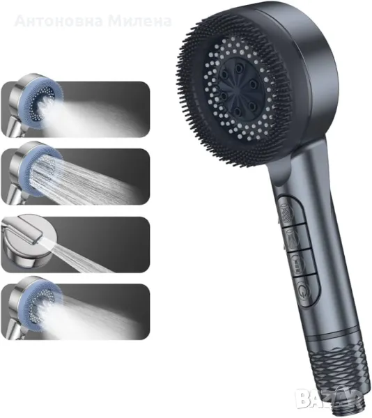 Ръчният душ с 4 функционални режима и подвижна мека силиконова четка е проектиран да осигури луксозно и персонализирано изживяване под душа. Със своите 4 уникални режима на пръскане, вградена ексфолираща четка и удобна функция за задно изплакване, той е идеалното допълнение към всяка модерна баня. Изработен от висококачествен ABS с елегантно черно покритие, този душ комбинира стил, функционалност и издръжливост.