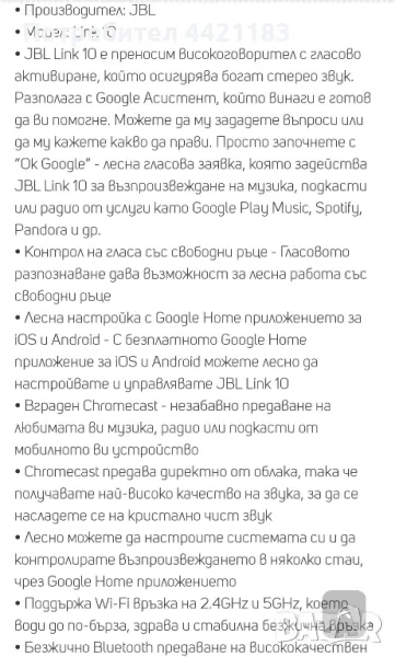 JBL LINK 10 с нова сменена батерия. Перфектно състояние и работа. Стерео звук на 360°, гласов Google асистент и работа с гласови команди. Свързване с интернет 2.4Ghz и 5Ghz безжична връзка. Блутут връзка от устройства и т.н. Пълните спецификации в интернет.
