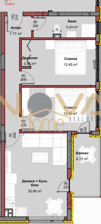Жилището се състои от входно антре, дневен тракт с кухненски кът с излаз на тераса, спалня с дрешник, втора спалня и баня с тоалетна.