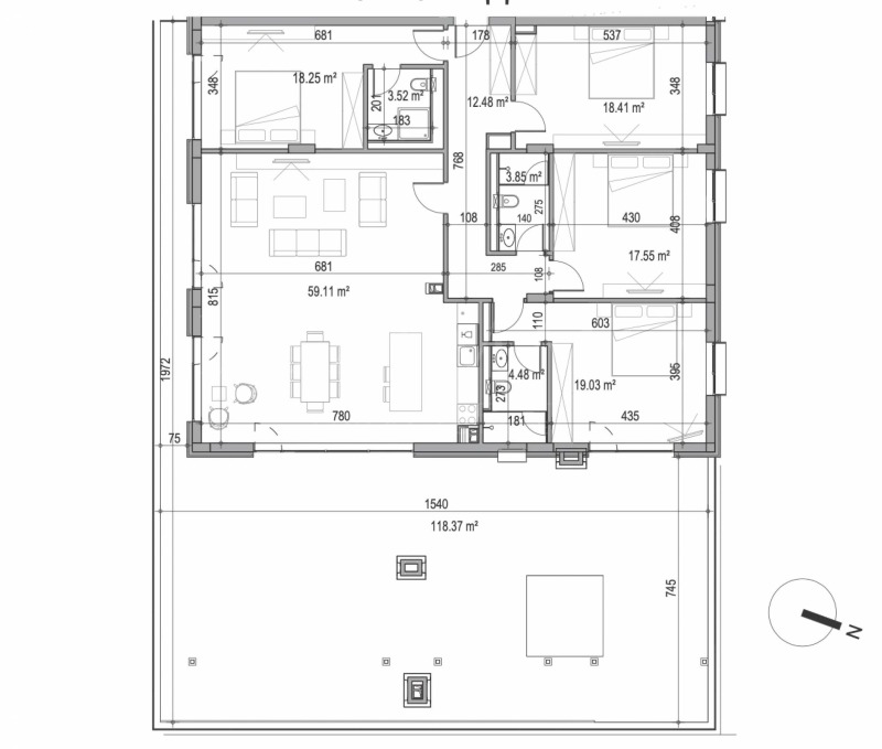 Апартаментът се предлага необзаведен, но за Ваше удобство има изготвен индивидуален интериорен проект.