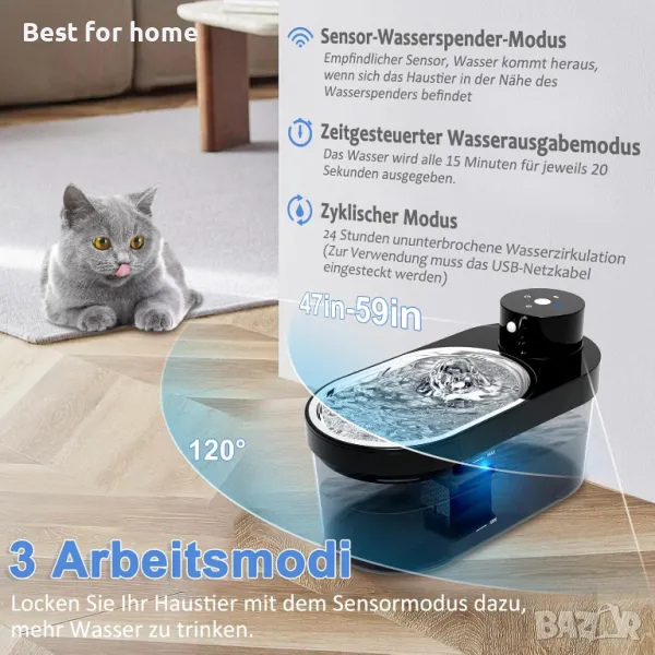 3 режима на работа Диспенсърът за пиене на котки има три режима на работа: постоянно изпускане на вода, изпускане на вода с време и сензорно изпускане на вода. В сензорен режим водата тече, докато котката стои близо до диспенсъра за вода, което кара вашия любим домашен любимец да пие повече вода