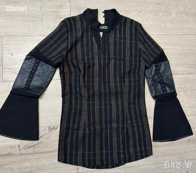 Елегантен сет от блузка М размер , панталон S размер , нежен текстил с кожени елементи и лъскави нишки , лека еластичност...
