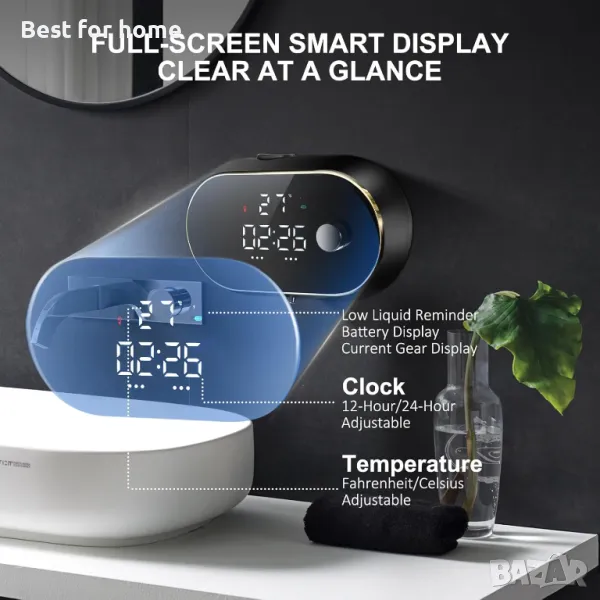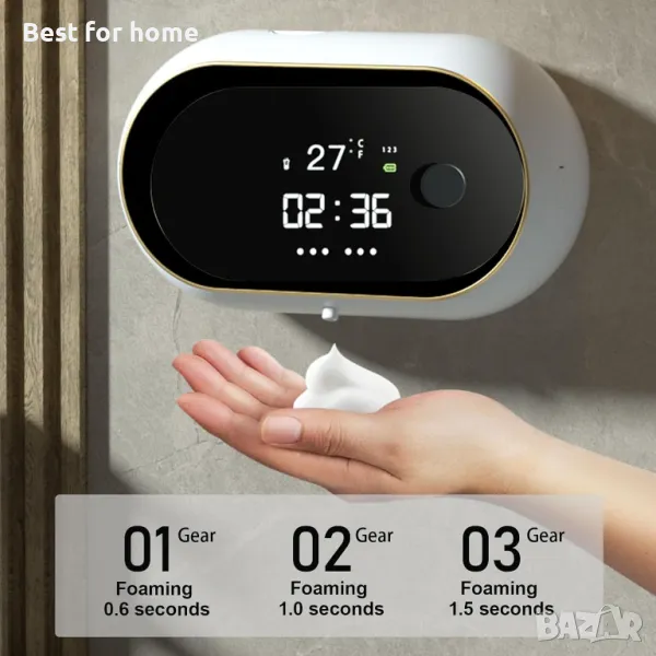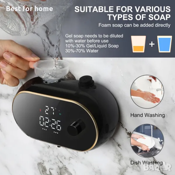Голям капацитет: 450 мл / 16 унции, съвместим със сапун за ръце, препарат за съдове и гел за тяло. Регулируеми нива на пяна (1-3). IPX5 водоустойчив, монтиран на стена за кухня или баня
