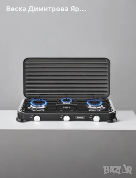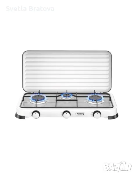 Троен газов котлон с капак. Покритие от въглеродна стомана. Горелка от лят алуминий с емайлирана капачка. Метална скара за тиган. По-добър пламък и по-бързо готвене. Икономичен и мощен. Висококачесвен, безопасен и лесен за използване. Мощност: 2 х 2.2 kWh+ 1 x 1 kWh. Тип газ: Бутан, Пропан и техните смеси. Налягане: 30 mbar.; Размери: 58х30х6 см Уредът е предназначен за използване на открито и проветливо място. Задължително прочетете инструкциите преди да изпозлвате уреда! ВНИМАНИЕ: Някой от частите може да са горещи! Съхранявайте и използвйте далеч от деца! Цвят: Черен, бял; 24 месеца гаранция.