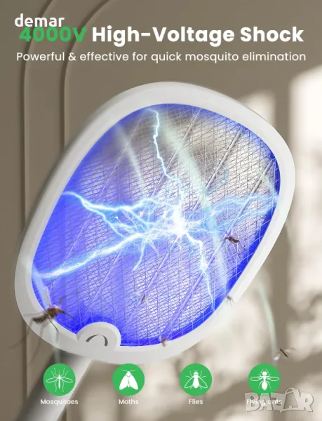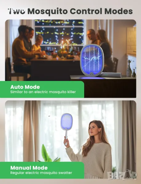 Този електрически уред за унищожаване на комари разполага с мощна решетка от 4000 V за ефективно елиминиране на комари, мушици и плодови мушици, с ръчен и автоматичен режим за двойна употреба - автоматичният режим включва привличаща светлина за комарите. Има акумулаторна батерия от 1800 mAh с порт Type-C и индикатор за батерията и 3-слойна предпазна мрежа за предотвратяване на случайни удари. Сгъваемият на 180° дизайн позволява използване на маса, лесно съхранение или окачване с ремък, което го прави идеален за дома или къмпинг.