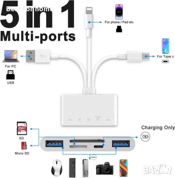 Четец на карти с памет 5 в 1, USB OTG адаптер и четец на SD карти за i-Phone/i-Pad, USB C и USB A устройства със слотове за Micro SD и SD карти, поддържа SD/Micro SD/SDHC/SDXC/MMC.