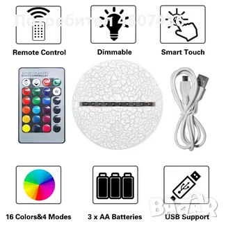 Иновативна и модерна нощна лампа с артистична атмосфера, проектирана с разнообразие от 2D графики, предлагащи 3D визуален ефект; тази светлина използва лазерно гравиран акрилен панел, за да ви даде жизнена 3D илюзия. 3D илюзионната лампа е нова настолна лампа със забавна атмосфера.