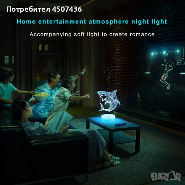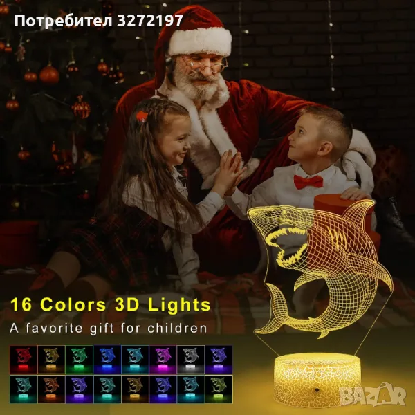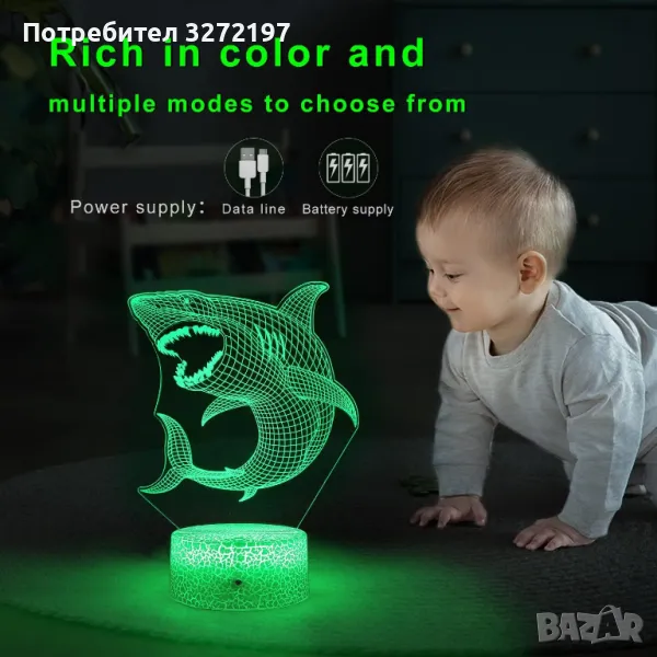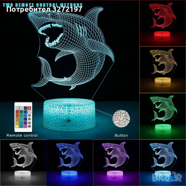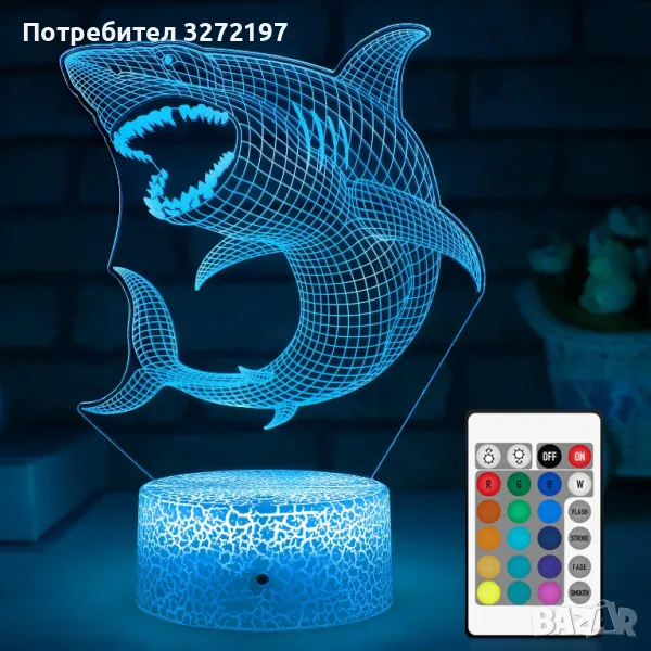 Холограмна 3D LED лампа Гладна Акула - дистанционно управление 16 цвята+други режими на управление