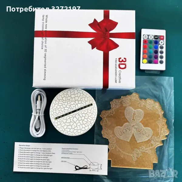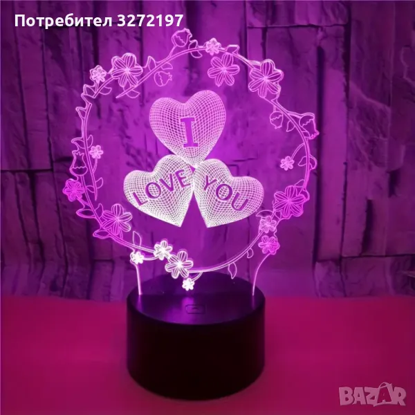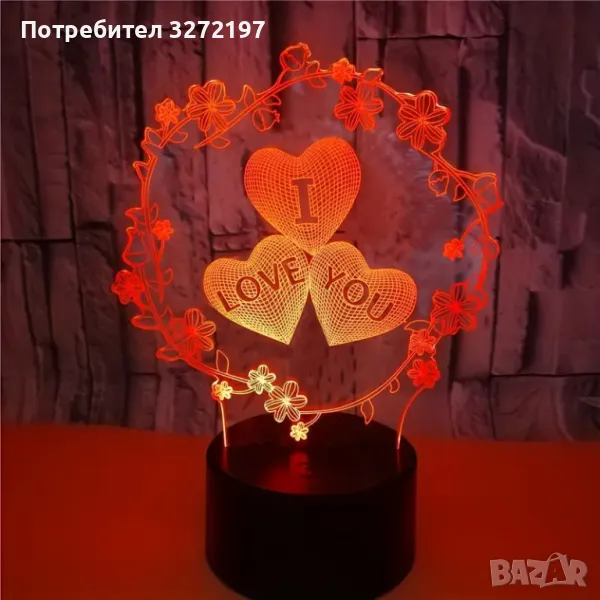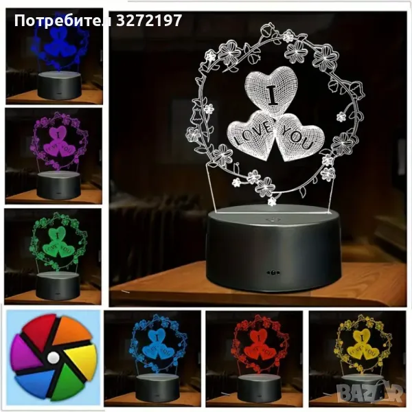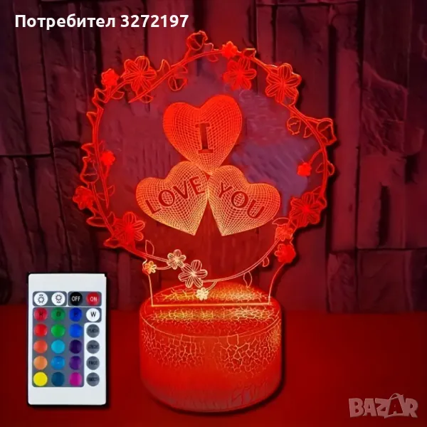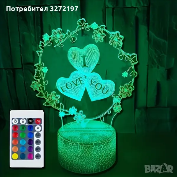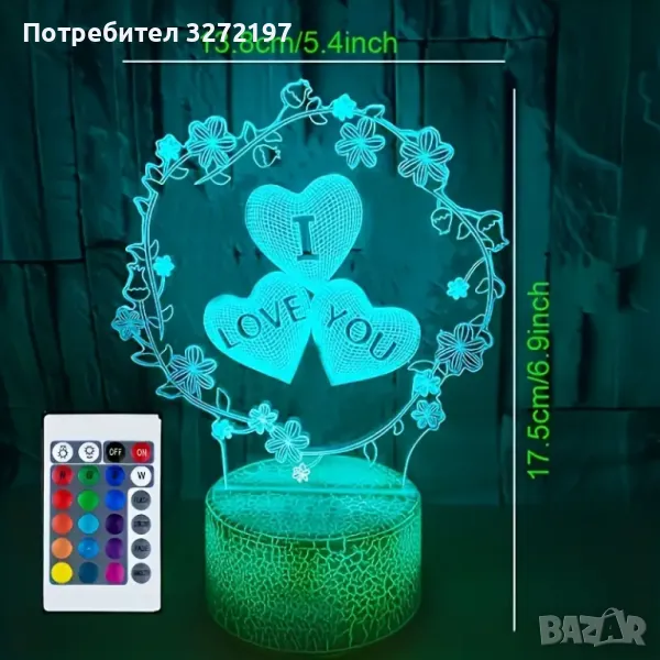 Холограмна 3D LED лампа Любов - дистанционно управление 16 цвята+други режими на управление