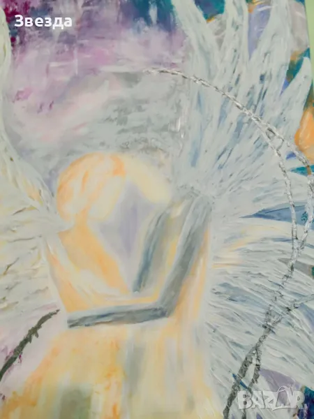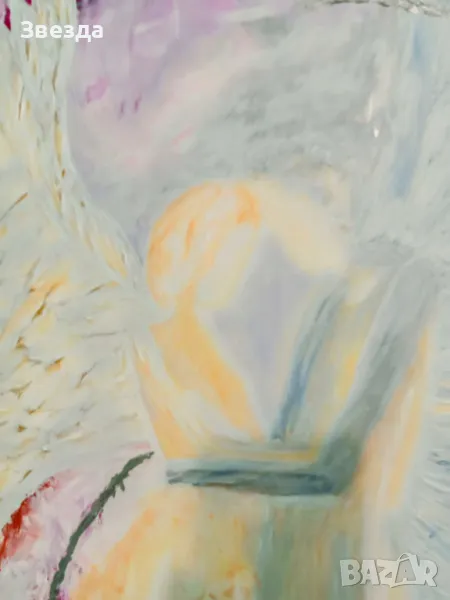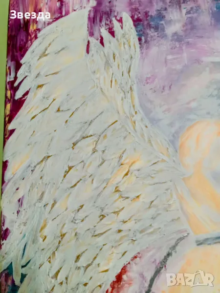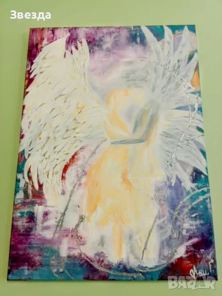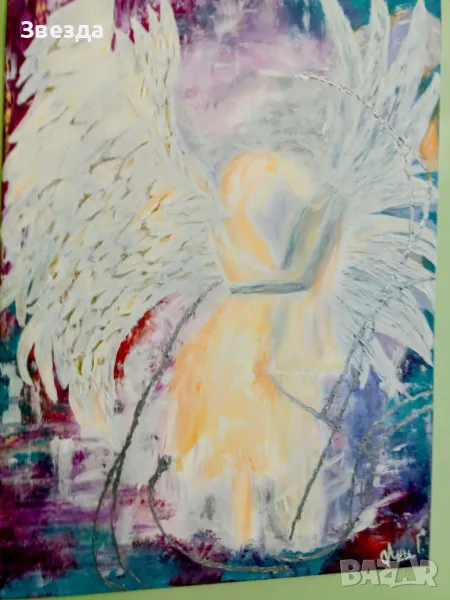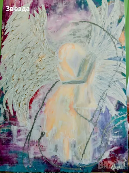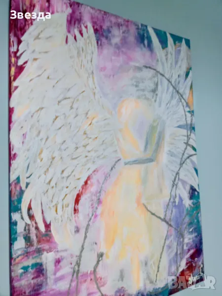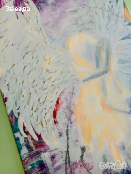 Крилете на ангела, изрисувани с деликатна прецизност, сякаш се разгръщат пред очите ви, готови да ви обгърнат в своята закрила. Цветовете се преливат един в друг, създавайки усещане за светлина и лекота, сякаш самата душа на ангела е вплетена в платното.
