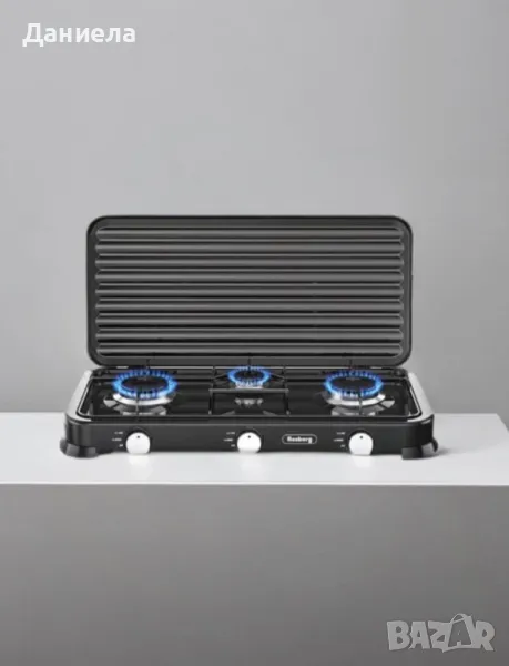 Троен газов котлон с капак. Покритие от въглеродна стомана. Горелка от лят алуминий с емайлирана капачка. Метална скара за тиган. По-добър пламък и по-бързо готвене. Икономичен и мощен. Висококачесвен, безопасен и лесен за използване. Мощност: 2 х 2.2 kWh+ 1 x 1 kWh. Тип газ: Бутан, Пропан и техните смеси. Налягане: 30 mbar.; Размери: 58х30х6 см Уредът е предназначен за използване на открито и проветливо място. Задължително прочетете инструкциите преди да изпозлвате уреда! ВНИМАНИЕ: Някой от частите може да са горещи! Съхранявайте и използвйте далеч от деца! Цвят: Черен, бял; 24 месеца гаранция.