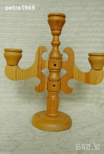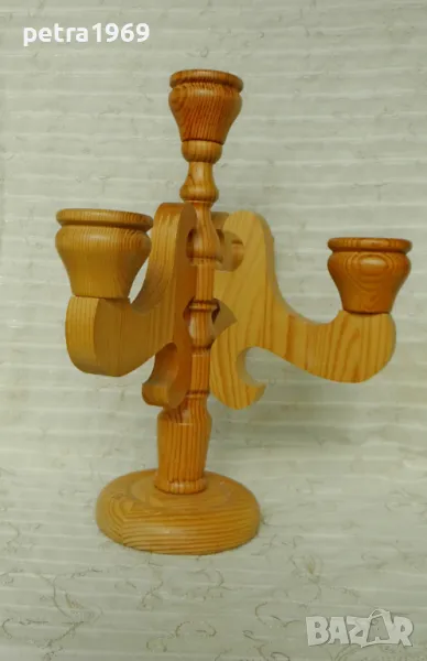 Разкошен голям дървен свещник. Здрав, без отчупвания и отчесвания, без пукнатини, без следи от употреба, изработен в Швеция. Висок е цели 35 см., основата е с диаметър 12,5 см. Има възможност за поставяне на 4 свещи. Детайлите са струговани, чашките са за свещи с диаметър до 2 см. Вероятно е имал четвърта част - от едната страна има дупки като за сглобка, но е много удобен за поставяне в този си вид. Цена, съобразена все пак, 40 лв.