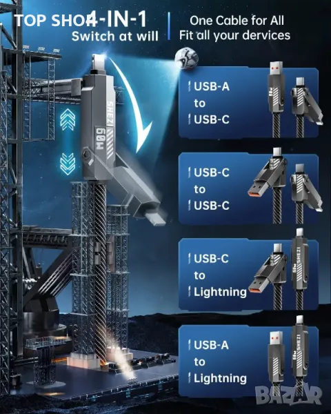 SHEZI 4 в 1 кабел за зареждане/данни с Lightning/Type C/USB A порт, 3 метра