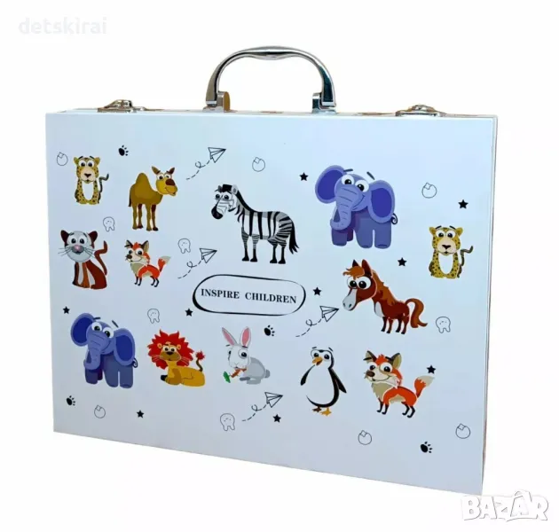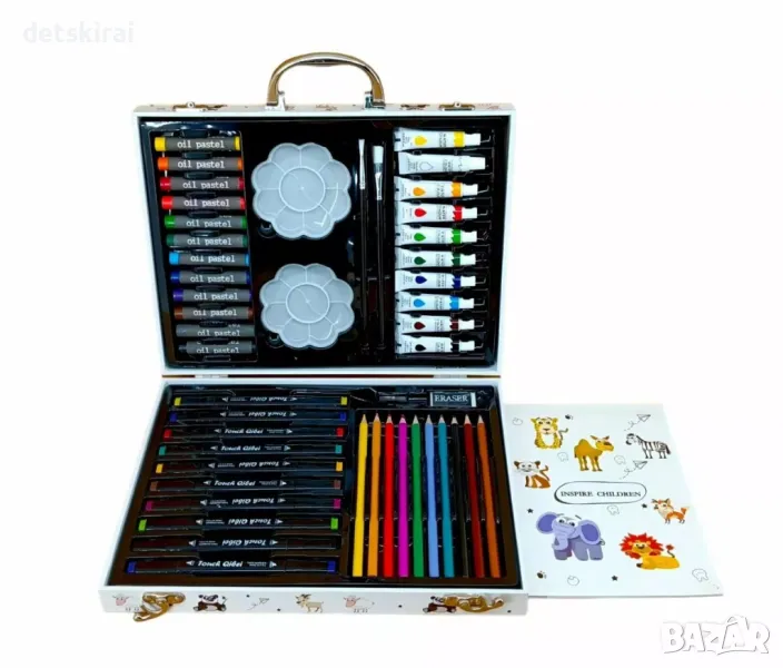 комплект за изкуство "всичко в едно", идеален за начинаещи художници и творчески умове. Този изчерпателен комплект включва разнообразие от инструменти за оцветяване и аксесоари, спретнато организирани в очарователен калъф с животински щампи, което го прави идеален за арт проекти у дома или в движение.