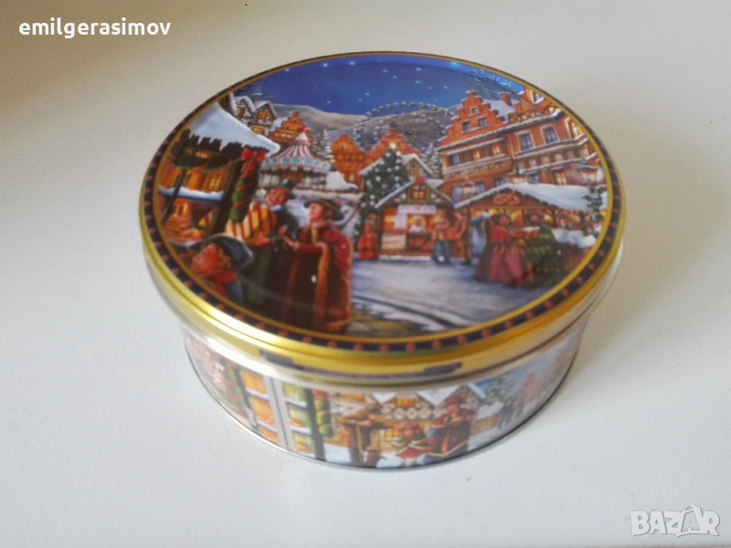 4. Красива ламаринена кутия с Коледни рисунки. Отлично състояние. Диаметър 14 см. , височина 5,5 см. Цена 4 евро.